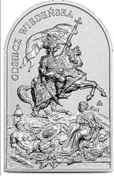 Rewers: Wzdłuż krawędzi, z lewej strony częściowo łukowato, napis: ODSIECZ WIEDEŃSKA. Centralnie postać króla Jana III Sobieskiego przedstawionego na koniu, z chorągwią i szablą, według tablicy z 1883 r.