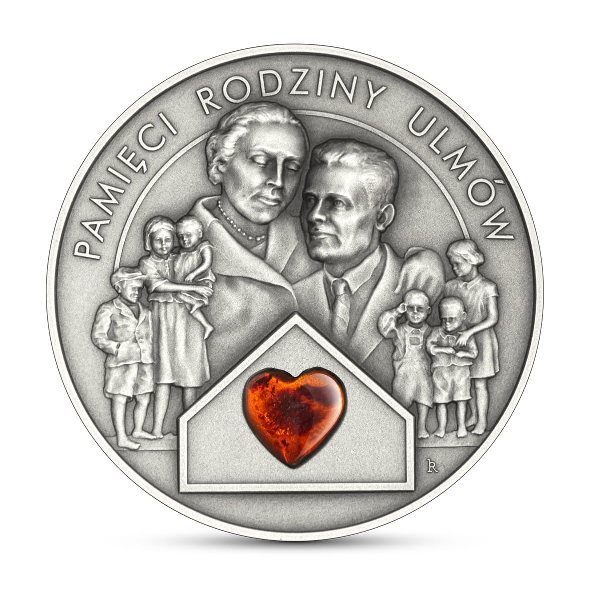 Pośrodku wizerunek Józefa i Wiktorii Ulmów oraz ich dzieci, z lewej strony Władysław, Stanisława i Maria, z prawej strony Franciszek, Antoni i Barbara. U dołu kontur domu z bursztynem w kształcie serca. Wzdłuż górnego brzegu półkolem napis: PAMIĘCI RODZINY ULMÓW.