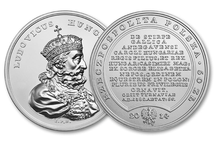 awers: W centralnej części monety czytamy w tłumaczeniu: „Z rodu francuskiego, syn Karola Andegaweńskiego, króla Węgier, król węgierski, Kazimierza Wielkiego z siostry Elżbiety siostrzeniec, stan rycerski w Polsce wielu swobodami ozdobił. Umarł w Trnawie Roku Pańskiego 1382, mając lat 56, panując w Polsce lat 12, dnia 12 września”. Wzdłuż otoku – napisy: RZECZPOSPOLITA POLSKA i nominał: 50 zł. W dolnej części monety – rok emisji: 2014 oraz miniaturowy wizerunek orła białego.