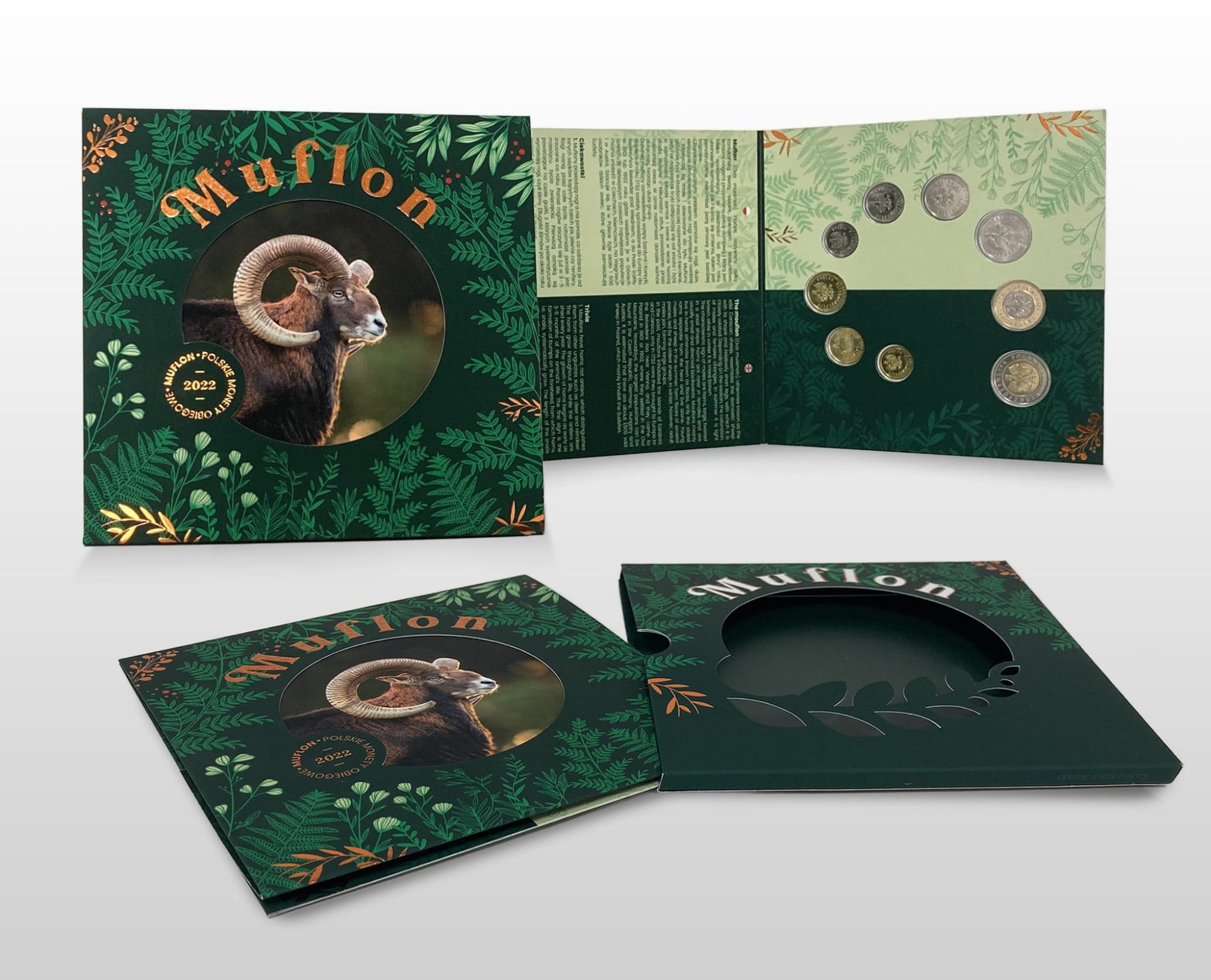 Monety obiegowe z 2022 roku (od 1 grosza do 5 złotych) z wyjątkiem 2 gr (2021 r.) umieszczone w ekskluzywnym blistrze z Muflonem.